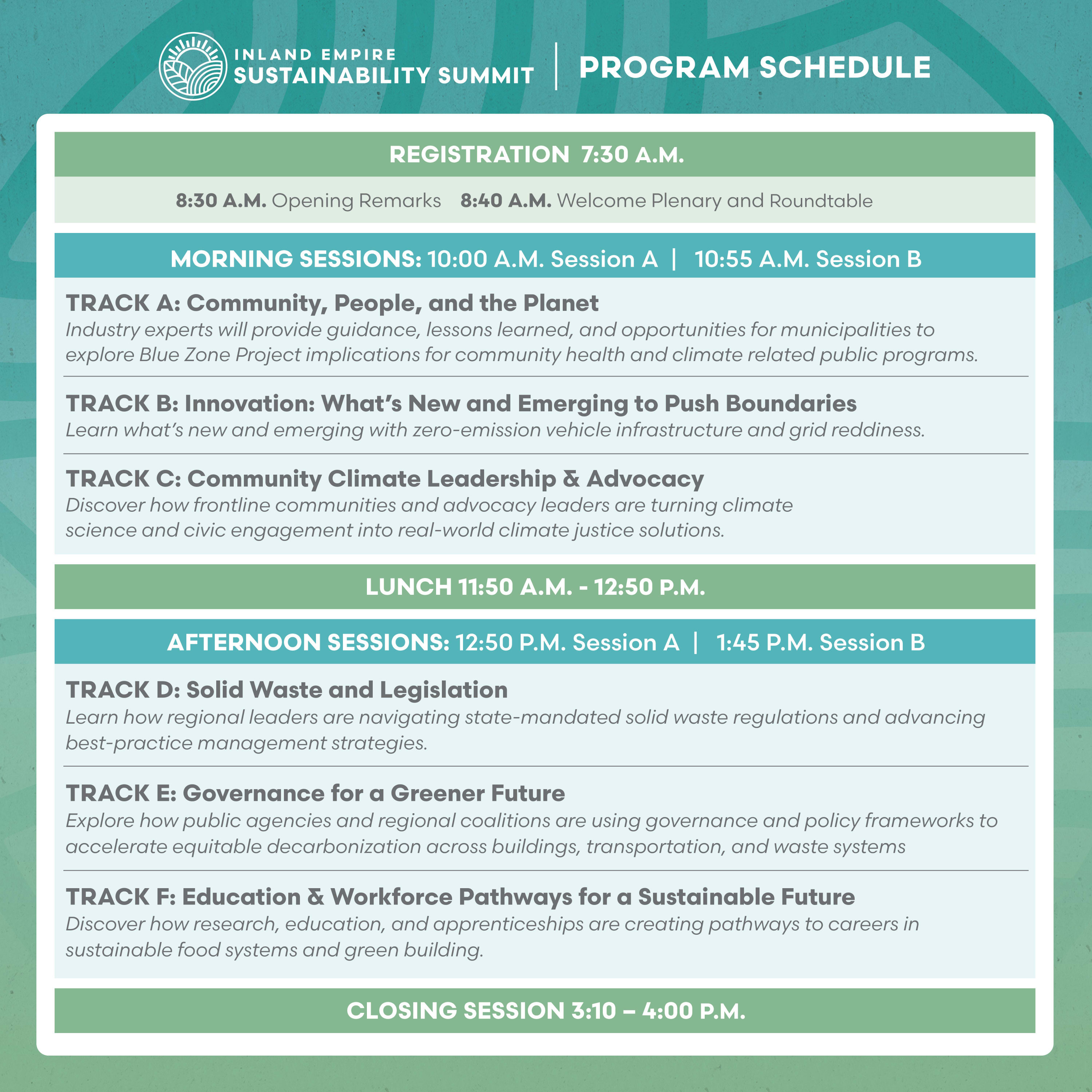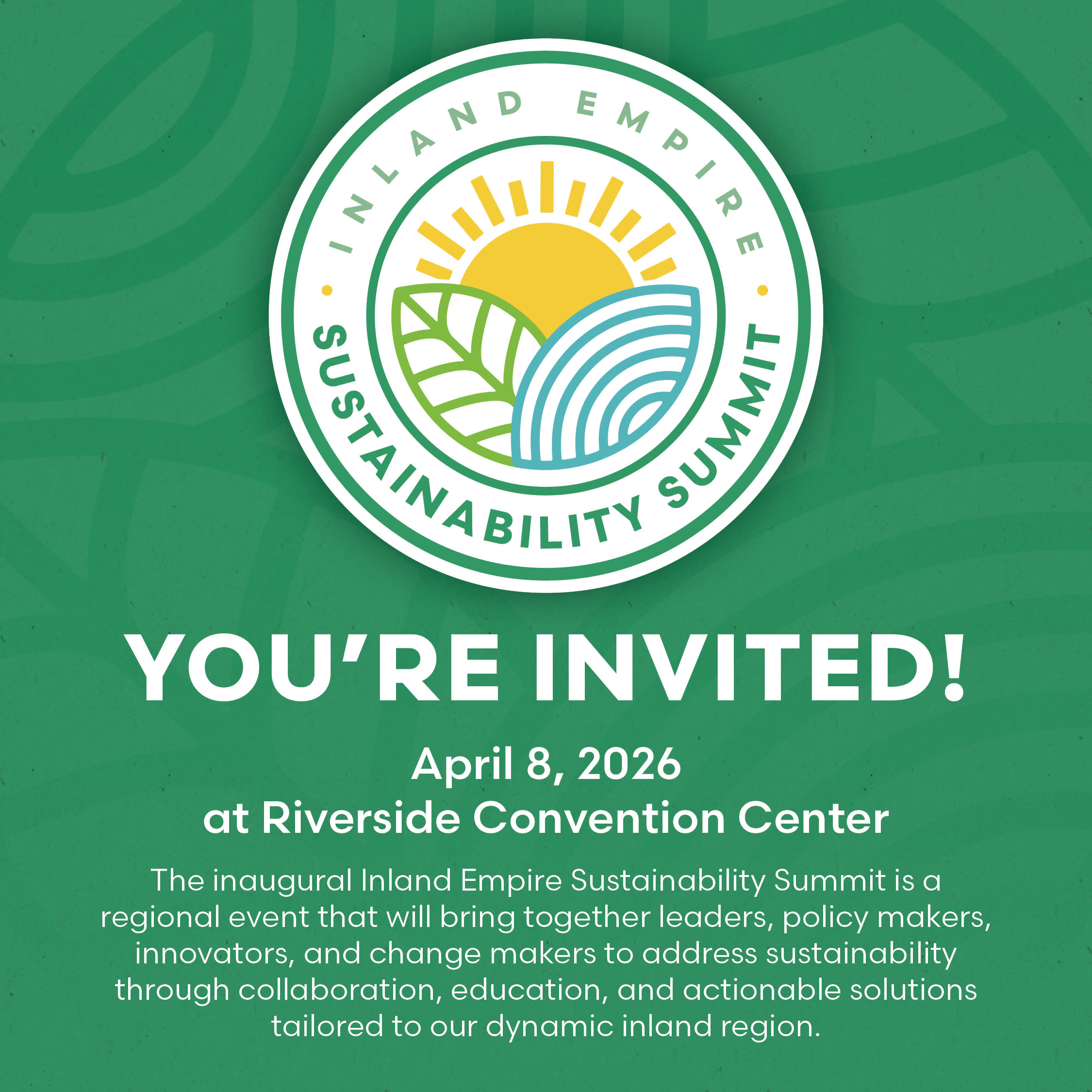 The inaugral Inland Empire Sustainability Summit will take place on April 8, 2026, at the Riverside Convention Center. This regional event will bring together leaders, policy makers, innovators, and changemakers to address sustainability through collaboration, education, and actionable solutions tailored to our dynamic inland region.